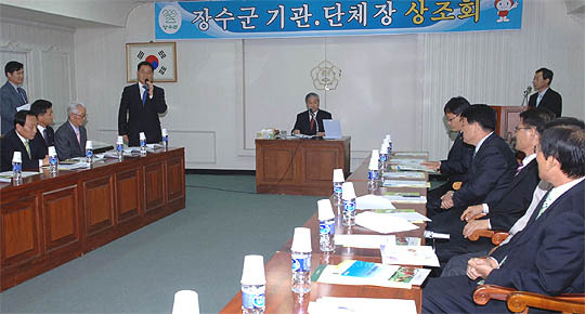 23일 군은 관내 기관단체장 상조회를 갖고 장수승마장 건립, 뜬봉샘생태공원, 인조 잔디구장, 골프장조성사업 등 주요 현안사업들이 차질 없이 추진될 수 있도록 협조해줄 것을 당부했다.