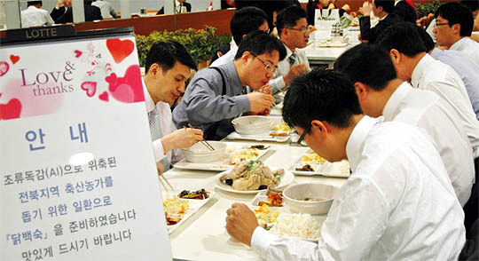 이날 점심시간을 이용해 구내식당에서 진행된 '삼계탕 먹는 날' 행사에는 2000여명의 백화점 직원들이 참여해 삼계탕을 먹으며 어려움을 겪고 있는 양계농가의 고통을 분담했다.