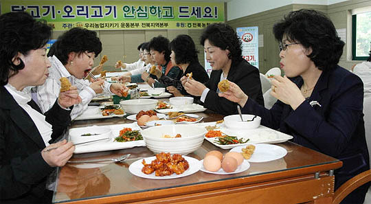 이를 위해 우리 농업 지키기 전북운동본부와 농협 전북본부는 24일 임직원과 농촌사랑봉사단 등 150여명이 동참한 가운데 닭볶음탕과 닭 가정, 삶은 계란 등을 준비해 시식행사를 가졌다.