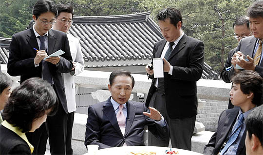 이 대통령은 이날 조류인플루엔자(AI) 파동과 관련해 청와대 춘추관을 예고없이 방문, 출입기자들과 삼계탕 오찬을 하면서 "바꾸면 또 새로 (훈련)해야 하고…기업에서 최고경영자 할 때도 느낀 건데 사람이 시련을 겪으면 더 강해지는 게 있다"며 이같이 말했다.