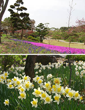 또한, 곳곳에 심어져있는 보라색 꽃잔디와 빨강,노랑,주황색의 튜울립과 노란 수선화,삼림욕장에 온 것 같은 착각에 빠질 정도로 심어져 있는 소나무들이 장관이었다.
