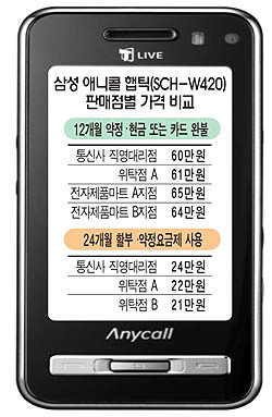 실제로 신규가입 조건으로 삼성 애니콜 햅틱(SCH-W420, SPH-W4200)을 24개월 할부와 지정요금제를 선택해 구입할 경우 전주시 고사동의 A통신사 대리점에서는 24만원에 기기를 판매했다.