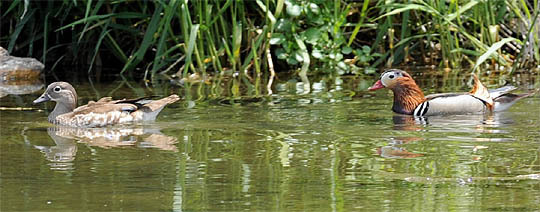 휜뺨검둥오리 옆에 평소 못 보던 새가 있어 망원경으로 확인해보니 놀랍게도 천연기념물 327호 원앙 한 쌍이었다. 수컷은 화사한 깃을 뽐내며 먹이를 찾고 있었고, 암컷은 모래톱에 몸을 쉬고 있었다. 원앙은 이곳에 이사 왔다는 것을 알리기라도 하듯 유유히 수면을 가르며 카메라 앞에 포즈를 취했다.