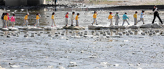 전주의제21은 물의 날을 맞아 지난 3월21일 전주시 및 지역 시민단체와 함께 전주천 덕진보 철거지점 인근서 갯버들 시집보내기 행사를 가졌다. 이날 행사에 참가한 유치원생들이 꺾꽂이용 갯버들을 들고 전주천 징검다리를 건너고 있다. 이강민(lgm19740@jjan.kr)