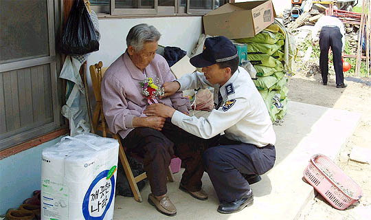지난달 8일 임실경찰 직원이 독거노인 가정을 방문해 어버이날 곷을 달아드렸다. (desk@jjan.kr)