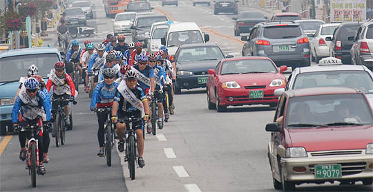 오는 27일 첫 '자전거 데이'를 20일 정도 앞두고 지난 6일부터 8일까지 시청 공무원과 시민들의 주요 출·퇴근길인 나운동과 대야면, 금강하구둑, 소룡동 등 4곳을 주요 방향으로 설정하고 자전거로 직접 돌아봤다. 그 결과 상당수 구간에서 '목숨걸고 타야하는 위험부담'이 그대로 바퀴에 묻어났다. 합격점을 줄만한 곳은 금강하구둑 연안도로 뿐이었다.