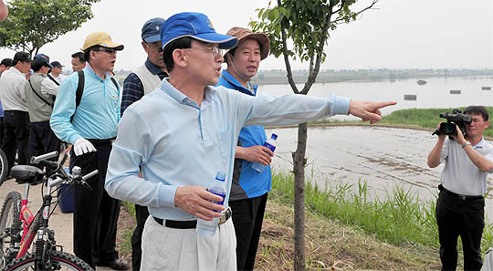 김완주 도지사는 8일 만경강 수질개선대책 수립을 위해 유관기관 관계자 30여명과 함께 자전거를 타고 만경강 제방길을 달리며 만경강에 유입되는 영농오염과 수질상태 등을 점검했다.
