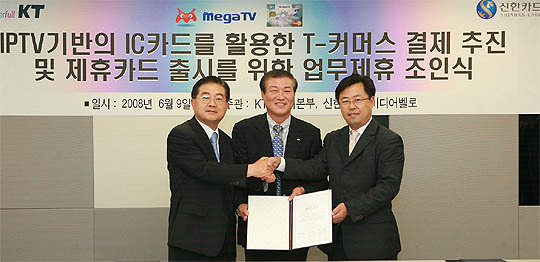 KT전북본부는 9일 신한카드 및 미디어벨로와 업무제휴 조인식을 갖고 IPTV기반의 IC카드를 활용한 T-커머스 결제·인증 서비스에 협력키로 했다. 또 이를 위한 'MegaTV A1카드'를 이달말께 출시할 예정이라고 밝혔다.