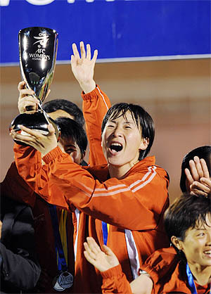 북한 선수들이 8일 베트남 호치민시(市)에서 벌어진 AFC(아시아 축구연맹) 아시안컵 여자축구 결승에서 중국을 2-1로 물리친뒤 아시안컵을 치켜들며 기뻐하고 있다.