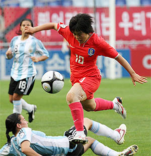 18일 수원월드컵경기장에서 벌어진 '2008 피스퀸컵 국제여자축구대회' 아르헨티나와 한국의 경기에서 한국 이장미(오른쪽)이 아르헨티나 수비수를 가볍게 제치고 있다. 한국 2대0 승. (desk@jjan.kr)