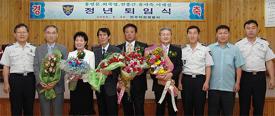 이날 퇴임식을 통해 퇴직하는 경찰관은 홍영문 팔복지구대 팀장, 최죽열 민원실장, 전종근 솔내지구대 팀장, 윤사숙 여성청소년계장, 이재상 상황실장 등 5명이다.