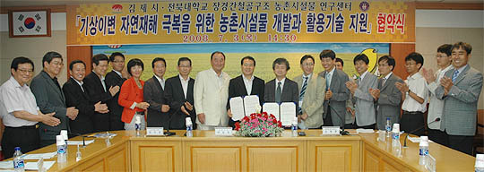 김제시와 전북대 장경간 철골구조 농촌시설물 연구센터(센터장 김영문)는 3일 김제시청 상황실에서 기상이변 자연재해 극복을 위한 '장경간 초경량 철골구조 농업시설물 개발과 활용 기술 지원'을 위한 협약식을 체결했다.
