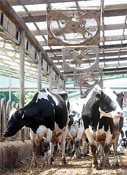 무더위에 지친 60마리의 젖소들이 천정에 달린 16개의 대형 선풍기 아래 모여 더위를 식히고 있다. 또 플래스틱으로 만들어진 축사의 천정에서는 3대의 스프링쿨러가 시냇가에서 퍼 올린 물을 연신 품어대고 있다.