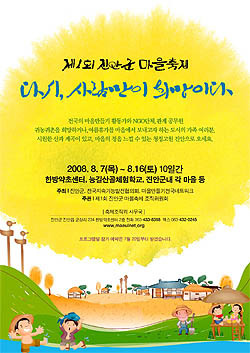 4개 마당으로 구성된 이번 행사는 △제3회 마을만들기 전국대회, 특별기획전시 전국마을만들기 정보교류의 장 상설운영 △제1회 여름밤 귀농귀촌체험축제, 귀농귀촌인 한마당 △농촌마을생활체험 '마을, 상상속으로', 백중날 행사 △진안 견학과 답사 등으로 이어진다.