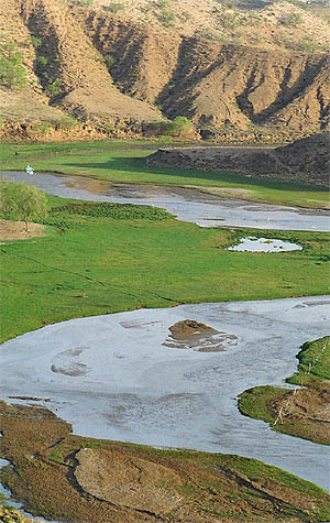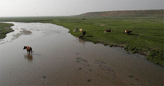"사지 주변 초원의 토양은 화산암과 점토로 이루어져 비가 내려도 땅 속으로 스며들지 못하고 80%가 증발해버립니다. 하지만 사지는 모래의 입자가 굵어 모세관현상이 발생하지 않고 빠르게 땅속으로 스며들기 때문에 쿤산다크에는 물이 풍부했습니다." 지질학적 근거를 드는 박팀장의 설명이다. 신두리 사구의 두웅습지처럼 땅속에 저장된 빗물이 저장되어 있다가 배후 습지를 형성하는 것과 마찬가지다. 우리의 목적지인 차깐노르 호수도 이곳에서 발원한 까오거스타이 강이 흘러 만들어진 것이다.