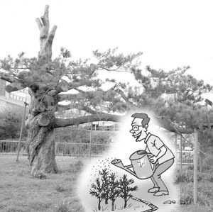이 나무를 살리기 위해 그동안 EM처리, 막걸리 처방, 옆면 시비, 토양교체 등을 추진, 일부가 생기를 되찾았다. 그리고 접목방식으로 8그루의 곰솔 2세를 얻었다. 장대한 기품을 안고 커 나갔으면 한다.