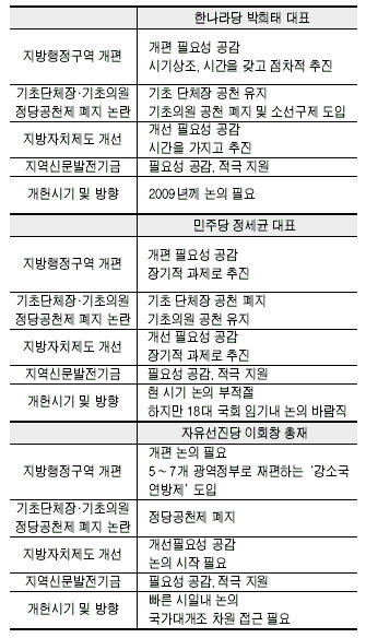 반면 지난 17대 국회 당시 여·야가 18대 국회에서 논의를 진행하기로 했던 지방행정구역 개편 문제의 경우 여당과 제1야당인 한나라당과 민주당이 개편 필요성에는 공감을 나타내면서도 '시기상조'라거나 '장기적 과제'로 처리하겠다는 인식을 나타내 이른 시일내 논의는 어려울 전망이다.