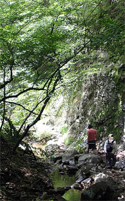 오솔길은 큰 바위를 칼로 내려쳐 만들어진 작은 계곡으로 이어진다. 물길 바로 윗부분이 사람이 다니는 길이요 짐승이 다니는 길이다.