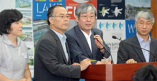 11일 전북도청 브리핑룸에서 온영태 새만금 국제공모심사위원장이(오른쪽 두번째) 새만금 국제공모 심사결과를 발표하고 있다. 이강민(lgm19740@jjan.kr)