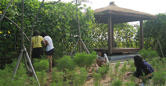 이 곳은 지난 4월부터 지평선축제와 추석때 고향을 찾는 출향인과 관광객들에게 풍요로운 가을 풍경을 제공하고자 3개소에 철제터널과 그믈망을 설치하고 사두오이 등 4개 품종 종자를 확보한 후 포토 죤 및 초가이엉 등이 어우러진 시골쉼터를 조성했다.