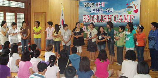 장수 와룡휴양림에서 열린 장수교육청의 제3회 영어캠프에서 원어민 영어보조교사들이 소개되고 있다. (desk@jjan.kr)