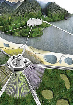 담수와 해수유통 구역을 제방겸 도로로 분리하고 각 수로에 발전설비를 두어 전혀 다른 형태의 도시를 구상했다. 또 띠모양의 토지가 반복돼 지루하다는 단점을 극복하기 위해 내부 호수를 수질에 따라 5개 권역으로 나눠 각 구역 중앙에 배치된 물과 핵심활동을 중심으로 공간을 구성했다.