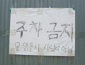 표현의 자유가 보장되는 민주사회라고 하지만, 어떤 이는 인신공격성 글을 아무렇지도 않게 써서 붙여놓았다. 전주 인후동 인봉초등학교 옆 도로에 주차공간을 찾다가 '주차금지, 못 읽을 시 사람이 아님' 이라는 문구를 보았다. 하도 어이가 없어서 웃다가, 그곳에 주차하면 정말로 인간이 아닐 것 같아 다른 곳에 주차를 했다. 남은 없고 나뿐인 세상, 공공도로를 자기 땅 인양 아무 거리낌 없이 빼앗는 사람을 떠올리며 씁쓸한 마음 피할 길 없었다. 혹시 한글을 아는 외국인들이라도 이 글을 읽게 될까봐 염려스러웠다.
