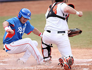 2008베이징올림픽이 계속된 20일 베이징 우커송야구장 메인필드에서 열린 한국-네덜란드전 8회초 1사 만루 이용규의 뜬 공 때 이택근이 홈인하며 네덜란드 포수 스미츠 쳐크의 태그를 피하고 있다. 한국이 10-0 콜드게임 승. (desk@jjan.kr)