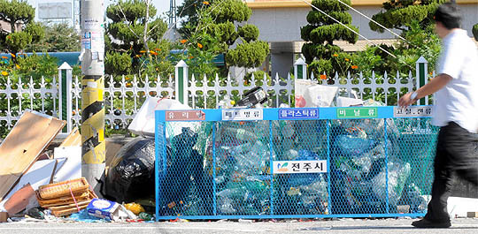 실제 27일 전주시 덕진동 종합경기장 주변의 일부 재활용품 분리수거함의 페트병류 칸에는 형광등과 종이 포장상자가 버려졌고 고철 칸에는 플라스틱용기가, 플라스틱류에는 비닐봉지 뭉치 등이 있었다. 또 1m 가량 떨어진 음식물쓰레기용기의 뚜껑을 열자 검은 비닐 봉지가 음식물과 같이 담겨 있었고, 일부 비닐봉지는 음식물찌꺼기와 함께 입구 부분에 붙어 있었다.