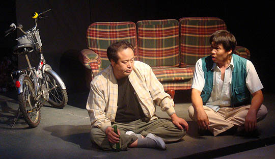 창작극회 124회 정기공연 '꿈꾸는 슈퍼맨' 시연회가 열린 2일 오후 8시 창작소극장. 시연회 전제는 세트나 조명 등 무대상황이 실제 공연과 다를 수 있다는 것. 중극장 공연을 앞둔 배우들의 연기는 과장돼 있을 정도로 힘이 넘쳤다.