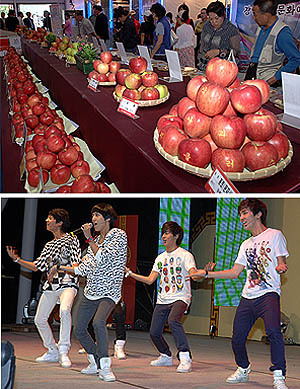 '2008 장수 한우랑사과랑 축제' 행사 일환의 하나로 열리고 있는 농산물체험관(위)과 지난 6일 열린 개막식의 한 장면. (desk@jjan.kr)