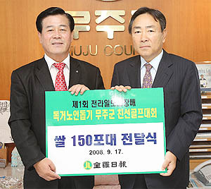 이날 무주군에 전달된 쌀은 지난 9일 개최됐던 '제1회 전라일보 회장 배 독거노인돕기 무주군 친선골프대회'수익금으로 마련된 것이라 훈훈함을 더해주고 있다.
