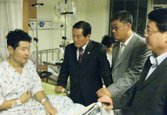 송영선 군수, 장현우 노조위원장을 비롯한 군청 직원들은 지난 9일 쓸개를 떼어내는 수술을 받은 김씨를 방문, 1차로 모금한 성금 1100여 만원을 전달했다.