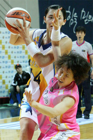 22일 안산와동실내체육관에서 벌어진 여자 프로농구 KB 국민은행과 신한은행의 경기에서 국민은행 김영옥(오른쪽)이 신한은행 강영숙을 수비하다 넘어지고 있다. (desk@jjan.kr)