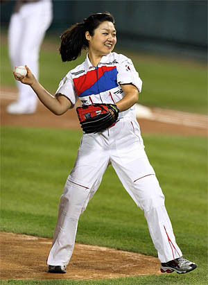 29일 오후 잠실 야구장에서 열린 2008 프로야구 한국시리즈 3차전 SK 와이번즈와 두산 베어스와의 경기. 우주인 이소연이 시구를 하고 있다.