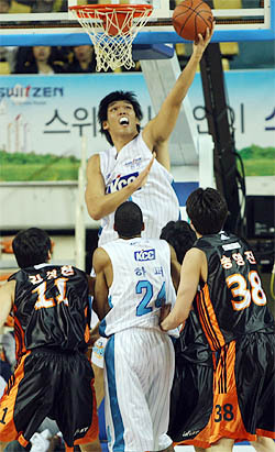 5일 전북 전주실내체육관에서 열린 프로농구 전주 KCC와 부산 KTF의 경기에서 KCC 하승진이 골밑슛을 성공하고 있다. (desk@jjan.kr)