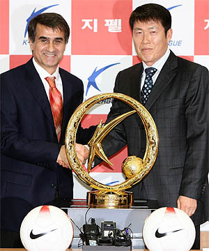 2일 서울 신문로 축구회관 내 프로축구연맹에서 열린 K-리그 2008 챔피언결정전 기자회견에서 그라운드에서 지략대결을 펼칠 수원 삼성의 차범근 감독과 FC서울 세뇰 귀네슈 감독이 황금빛 우승트로피 앞에서 선전을 다짐하는 악수를 하고 있다. (desk@jjan.kr)