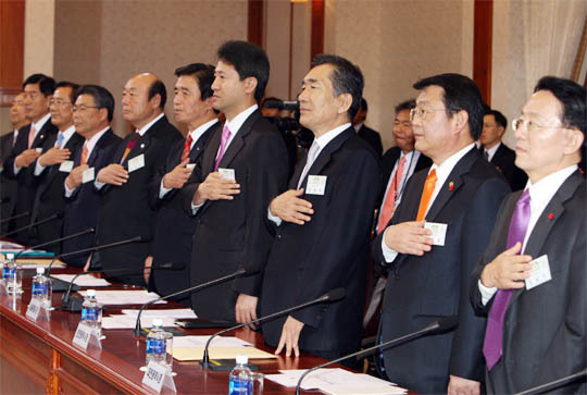 4일 오후 청와대에서 열린 시도지사회의에서 참석자들이 국민의례를 하고 있다. (desk@jjan.kr)