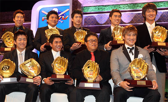 11일 오후 코엑스에서 열린 삼성PAVV 프로야구 2008 골든글러브 시상식에서 각 부문 수상자들이 포즈를 취하고 있다. 위줄 오른쪽부터 시계방향으로 롯데 박기혁(유격수), 두산 홍성흔(지명타자), 롯데 가르시아를 대신해 김무관 코치(외야수), 두산 이종욱(외야수), 롯데 강민호(포수), 두산 김현수(외야수), 한화 김태균(1루수), SK 김광현(투수), 롯데 조성환(2루수). (desk@jjan.kr)