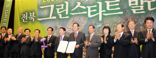 전북도와 전북의제21 등 시민사회단체는 지난 12일 오후 도청 대회의실에서 '저탄소 녹색성장을 위한 전북 그린스타트 발대식'을 갖고, 각 분야에서 온실가스 줄이기 실천을 다짐했다. 이날 행사에는 김완주 지사와 각 시·군 단체장, 김희수 도의회 의장을 비롯, 도내 각 시민사회단체와 기업인·농민·주부 등 모두 700여명이 참석했다.