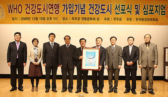 한국환경정책학회 주관으로 열린 이번 심포지엄은 무주군 건강도시 연맹 가입을 축하하고 전문가들의 의견 등 발전방안을 모색하기 위한 것으로 이날 세계보건기구 건강도시 인증서 전달 및 선언문 낭독, 주제발표, 종합토론 순으로 진행됐다.