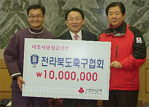 전북축구협회(회장 유창희)는 구랍 31일 전라북도 사회복지공동모금회에 이웃돕기 성금과 성품 1000만원 어치를 전달했다.