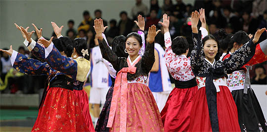 2009년 첫날인 1월 1일 안양실내체육관에서 벌어진 프로농구 서울 삼성과 안양 KT&G의 경기에서 한복을 입은 치어리더들이 흥겨운 율동을 선보이고 있다.