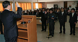 지난 2일 진안군청 시무식장에서 안동환 진안보건소장 등 5명이 공직자 500여 명이 지켜보는 가운데 금연선서를 하고 있다.