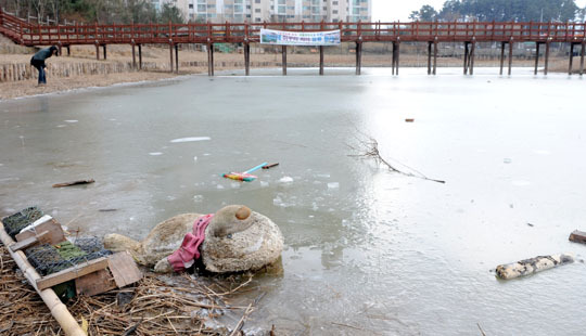 실제 5일 지시제를 둘러싼 나무다리는 일부가 파손, 가라앉아 있었고 인근 의자에는 낯뜨거운 낙서가 흉물스럽게 있었다. 물가에는 종이팩·인형 등 쓰레기들이 떠 있었다.