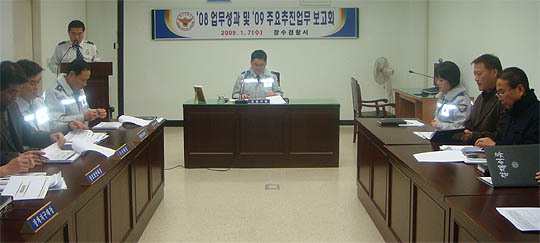 장수경찰서(서장 백순상)는 7일 경찰서 2층 회의실에서 각 과·계(팀)장, 지구대장, 파출소장, 분소장 등 25명이 참석한 가운데 2008년 업무성과 및 2009년 주요추진업무 보고회를 개최했다.