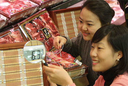 11일 농협 하나로클럽 양재점 직원이 설을 앞두고 출시된 디지털 온도계를 부착한 한우선물세트를 선보이고 있다.