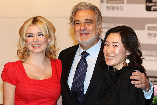 세계적인 테너 플라시도 도밍고(Placido Domingo)가 13일 올림픽공원 체조경기장에서 영국 출신의 메조 소프라노 캐서린 젠킨스(왼쪽), 소프라노 이지영(오른쪽)과 함께 내한공연을 하기에 앞서 12일 오후 삼성동 그랜드 인터컨티넨탈 호텔에서 기자회견을 하고 포즈를 취하고 있다. (desk@jjan.kr)
