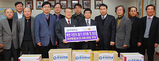 우석대가 12일 북한 어린이를 돕기 위한 생활 의약품 2000만원 상당을 재단법인 모음(옛 한민족복지재단)에 전달했다.