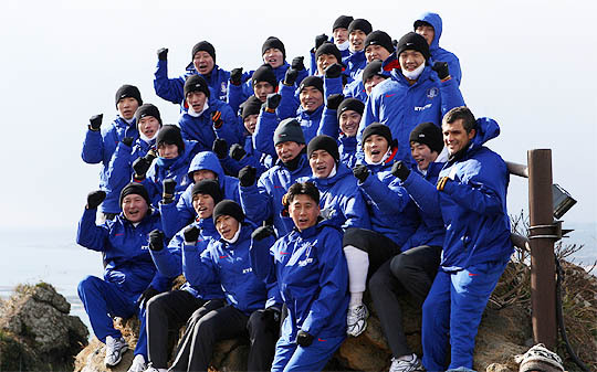 다음 달 11일 열릴 2010 남아프리카공화국 월드컵 아시아지역 최종예선 이란 원정경기를 앞두고 새해 처음으로 모여 훈련 중인 축구대표팀은 소집 이틀째인 12일 한라산에 올라 심기일전하려 했지만 기상 사정으로 이를 취소하고 성산 일출봉을 올랐다.